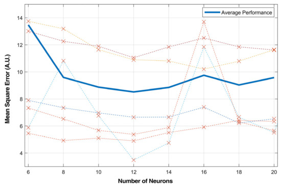 In the proposed model, the number of hidden layer neurons was swept from 6 to 20 for model evaluation. The results are shown in Figure 9. It proved that increasing the number of neurons in the hidden layer did not necessarily improve the estimation accuracy of a recurrent network. In the parameter sweep test, the best performance was achieved with around 12 neurons. The MSE did not decrease after increasing the number of neurons. Taking the MSE variance over all subjects into consideration, the choice of 14 neurons reached the minimum value, thus increasing the generalization abilities of the model.