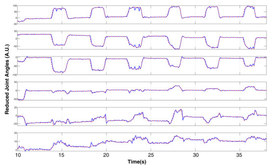 The post-processing module had two steps. First was an inverse PCA converter to reconstruct the signal of the joint angle. The second part was the signal conditioning to improve the accuracy of the output by a simple Extended Kalman Filter (EKF) for the noise canceling. Kalman filters have been applied in time varying systems for better performance [42]. The representative results are shown in Figure 11. The overshoot was reduced by the Kalman filter and the reaction time was not undermined.