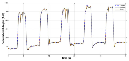 The example result of the output of the NARX model compared with the target reduced joint angles is shown in Figure 12 (all 6 output channels) and Figure 13 (single channel) from a subject. The output signals in the rest phase were steady, and the reaction time was kept low when the finger movement was triggered. The output signal had good consistency compared with the original target signal. The MSE and regression value of the model were computed to further evaluate the accuracy of the outputs; the results are shown in Table 1. The results indicated that the model was adequate for a multiple DoF application with accuracy and real-time requirements.