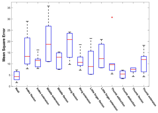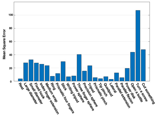 In the NinaPro dataset, besides basic finger movements, each participant was required to perform 23 kinds of functional movements in daily activities. In the model training processing, these data were excluded from the training sets on purpose. These datasets were used in this section as the input for the trained NARX network. The comparison of the NARX model output and the target output is shown in Figure 15. The error plot indicates that the maximum error of daily life functional movements samples is less than 13% compared with the target joint angles. The MSE error differed from movements to movements, as shown in Figure 16. It was noteworthy that, approximately, the more the fingers were involved in a single movement the higher the MSE would be. This phenomenon implied that crosstalk might occur between different muscles. The result demonstrated that the pre-training with user data can be done with basic movements solely. Therefore, the user could perform predetermined basic finger movements as the training data for the NARX model controller, which reduced the training process for adoption. The gathering procedure was thus simplified and could be standardized, which was beneficial for reducing the ambiguity in training data. Moreover, the performance could be increased with training data of movements of two fingers simultaneously taking the crosstalk into consideration. As a result, the required time for users to adapt to prosthetic hand movement could be reduced.
