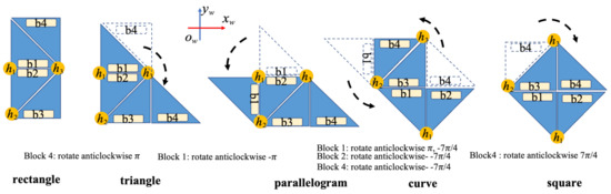 The prefabricated workspace is divided into a predefined size polyabolo-based connected network in which each cell’s size is equivalent to robotic cubes. The robot inside this workspace is described as a reference 4D coordinate that includes the gravity center of hTetran platform , the tile T, the orientation heading . The modules and block actions of the hTetran structure with the robot structures of five accessible forms of the four-block areas on the hTetran header inside the workspace are depicted in Figure 4. The required actions of hTetran shapeshifting in the sequence among the available rectangle, triangle, parallelogram, curve, and square around the dynamic axis ID joins presented as is fine-tuned by the necessary point revolutions of the robot block. The hTetran area of a square b is denoted by , where b is in the four modules of hTetran which can be obtained from the robot morphologies inside the workspace. The masses of all modules are distributed among .