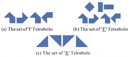 The hTetran platform applies the Polyabolo tiling-based path planning during the area coverage of the predefined workspace. The presented work is our initial attempt to implement Polyabolo tiling as a coverage path planning technique in a reconfigurable robot. Specifically, we evaluated the tiling theorems, where they tiled a regular polygonal area using only ‘I’, ‘T’, and ‘X’ tileset pieces. Figure 5 shows the tile pieces that belong to each mentioned tileset. In the experiments, we only used the ‘I’, ‘T’, and ‘X’ tilesets to perform the area coverage. The three theorems that will be used in our experiments are detailed below.