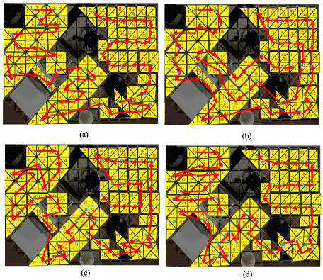 During the real workspace trials with the paths that were generated, the robot’s energy and time to clear the waypoints found in the sorted data set were evaluated. The robot was placed in continuous self-government and exploration mode to adjust its COM for each of its characteristic reference points, reinforcing its ideal area and shape. The robot roadmap works with the node components and topics provided in the ROS framework. The development requirement robot locomotion of the adaptive feedback control (PID) was developed in our previous work for tiling robot [41]. Once the title was identified, the motor controllers drove servo motors to the direction so that the locomotion units of four blocks were aligned with the direction of the waypoints, then activate DC motors to generate the linear motions.