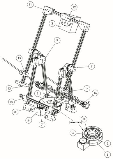 Structural components (Figure 3) have been chosen according to the assumptions raised from initial sketches and should be low-cost and easy to find on the market. Extruded aluminum profiles are commonly used in industry for manufacturing machines, supports, fences, among others. Due to their flexibility, high variability and lack of machining, assembly costs are reduced. The main bearing involved in turning the table has been selected to withstand the high radial and axial load [36].