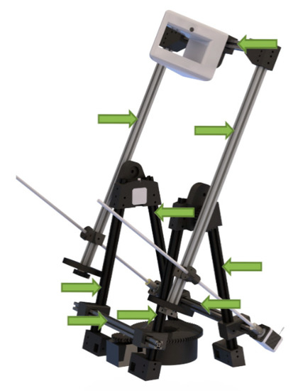 The structural set enables the adjustment of the different camera or 3D scanner models, modifying the elements (6), (8), (10), (11), (13) and (15) shown in Figure 2, allowing the variation of the workspace, which can be easily adapted by replacing the aluminum profiles and modifying the initial system counterweights.