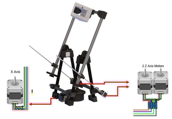 - Stepper motors Nema 17, 1.8° pitch angle (200 steps per revolution): Two motors in the corresponding pin of the Z axis are responsible for the optical equipment rotation, and in the X axis, one is responsible for the rotation of the movable table (Figure 5).