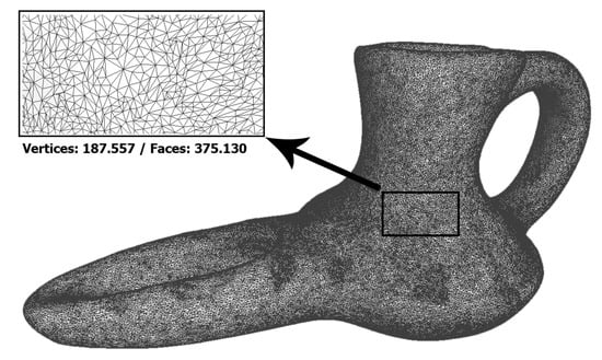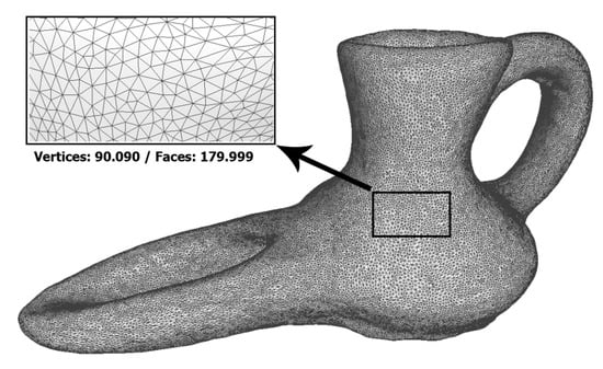The laser triangulation scanner (close range laser scanning or CRLS) [18] can document a close range of shapes in three dimensions with great detail and precision. A 3D scanner can measure the distance of many points, obtaining angular data, being able to calculate the three-dimensional coordinates of these points. Therefore, the set of points in a three-dimensional coordinate system is called a “point cloud”, which is more precisely defined as “thousands of individual measurements in a three-dimensional coordinate system (x, y, z), which a in turn, they compose a three-dimensional model of the registered objects. Although, if the set points have no further processing, they are considered as a very simplified model that operates only visually, because it only consists of unique point entities” [19]. The advantages presented by this system (precision, speed and, generally, software specifically designed for each type of scanner) can sometimes be counteracted by the complexity of the equipment necessary for their management.