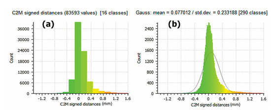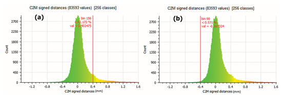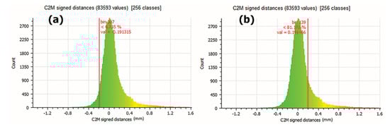 As summary, if a limit of ±0.2 mm is marked (Figure 16), the coincidence of the points represents 76.437% between the points of the two meshes. This percentage of coincidence rises to 91.601% if a limit of ±0.4 mm is established (Figure 17).