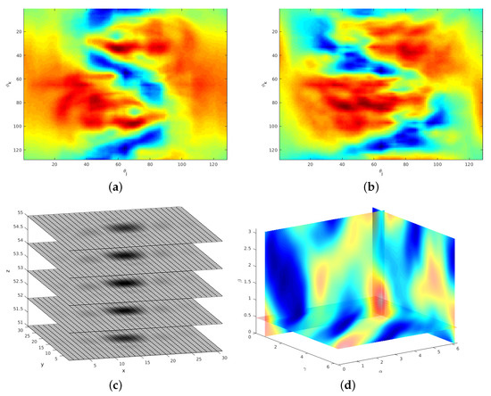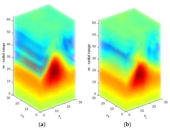 Two functions on a sphere are related according to (3) by 3D rotation, which are supposed to be resampled from the 3D spectral data of the rotated volume data. is defined as . The pair of functions in (3) is resampled from the 3D spectral magnitude (2) according to (4) using (5). is the length of the cubic size 3D data and thus the length of . The necessary rotational match according to the integral in (8) can be determined by the SOFT algorithm [34,35].