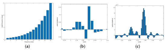 Limited radial resampling function for the determination of scale parameter. A clear peak from phase matching of the Mellin descriptor functions is visible despite the very limited signal information. (a) Logarithmic resampling function of the restricted frequency range (radial range—m). (b) Scale registration peak—according to the resolution shown in (a). (c) Scale registration peak—oversampling factor 4.