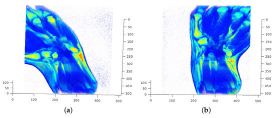 MRT scans of the human hand. Top view of the full voxel images used in the experiments. (a) Outer left position of the sequence. (b) Outer right position of the sequence.
