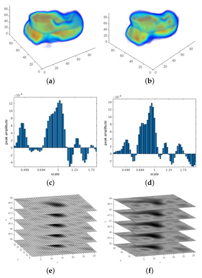 The 3D descriptor function (16) is generated by resampling the aligned spectral magnitude according to (6). An example for a resulting pair is shown in Figure 3. For the cubic resolution of used in these experiments, the effective number of bins is theoretically 10, namely from bin 2 (the lowest frequency) to 11. The actual number of frequency bins used in our implementation is 16 in order to increase the resolution of the logarithmic grid. For a subpixel shift, the derivation in [41] showed that the POMF transfer function of resampled data consists of polyphase components of a filtered unit pulse. Figure 4b shows an exemplary Dirac peak for scale registration. In this example, both objects have a significant scale difference of . The resulting scale parameter is using a subpixel interpolation [41]. The integer index of the maximum itself indicates a scale of , a non-acceptable large deviation from the true parameter.