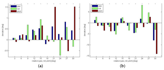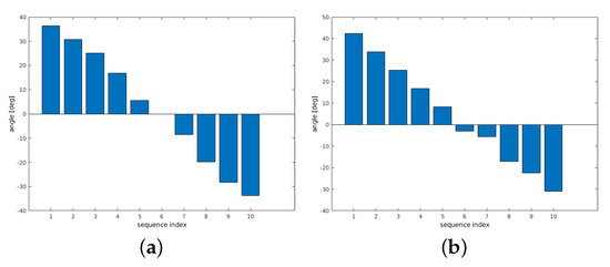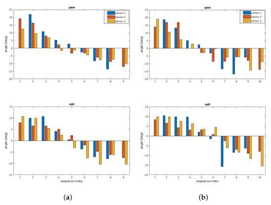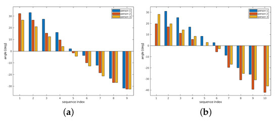 In the following, the term original rotation denotes the result of the FMS registration using segmented data as described in Section 5. The correctness of the determined transformation parameters can be assessed according to the overlay representation of the corresponding bones in their separate positions of the hand movement. Figure 10 shows the movement of bone B1 in all test persons. The plots show only the yaw rotation, which is the only significant B1 angle within the hand movement. Roll and pitch undergo only minor changes within .