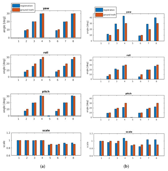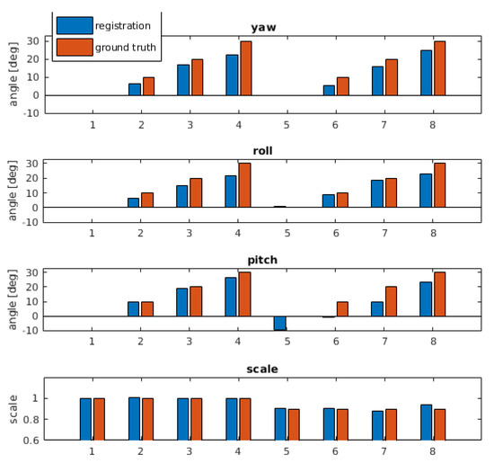 Alternative registration methods like Go-ICP [22] and spectral methods, for example, the principal axis approach [23,24,25], fail for the experiments described above, that is, they produce alignments that are clearly not corresponding, respectively they generate random distributions of errors in the ground truth experiments. To be fair, it has to be stressed that these methods, like almost all state-of-the-art registration methods, are 6-dof approaches, that is, they do not take scale into account. But even the original version of the 7-dof FMS algorithm fails on this data. Nevertheless, LF-FMS has also its limitations, which are illustrated in the following experiments in comparison to FMS.