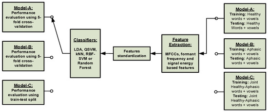 - Model-C: training of the ML framework with healthy datasets and testing with the aphasic patients’ datasets.