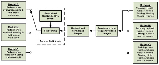 Due to the unavailability of a large speech dataset, transfer learning (TL) was utilized for training the CNN model in this paper. The ResNet-34 pre-trained CNN model was employed, which was fine-tuned with healthy participants’ speech or patients’ speech time-frequency distribution (TFD) images based on the choice of classification models shown in Figure 2 [34]. Two separate models for the two datasets: the vowels + words dataset (26 classes) and the only-words dataset (20 classes), were trained for each classification models. In order to utilize the weights of the pre-trained ResNet-34 model for transfer learning, all TFD RGB color images were resized to 224 × 224 × 3 pixels and normalized as per ImageNet dataset characteristics, before feeding them to the pre-trained ResNet-34 CNN model [34]. Cyclical learning rates with a maximum learning rate of 0.03 was used to fine-tune the pre-trained model [35]. A learning rate range test was used to estimate the maximum learning rate’s optimum value [35]. ADAM optimizer with default parameters for β1 = 0.9 and β2 = 0.999 was used for training, with a cross-entropy loss function [36]. To prevent overfitting, weight decay was utilized with a multiplying factor of 0.01, which was chosen empirically [37]. A five-fold cross-validation was adopted to estimate the performance of the classifier in classifying the two datasets for Model-A and Model-B, while a train-test split method was used for Model-C. The CNN model for the classification of the vowels + words dataset was trained for 20 epochs, and the model for the classification of the only-words dataset was trained for 15 epochs. A batch size of 128 was used for both datasets. All models were trained on NVIDIA Tesla P40 GPU in fastai, a PyTorch-based deep neural networks library [38].