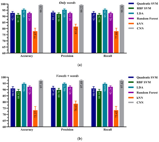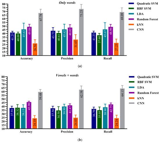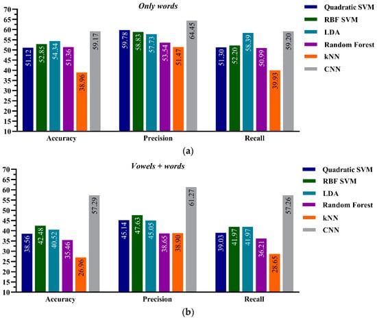 Performance evaluation for the CNN and CML classification frameworks, Model-B, on (a) the Only words of aphasic patients’ dataset-type and (b) the Vowels + Words of aphasic patients’ dataset-type.