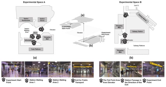 In the experimental process, first, the participant was given an explanation about the entire experiment in the waiting space inside the station, and they moved to the starting point of the experiment. At this point, the following “vignette,” as a wayfinding mission, was given to the participant: “You just arrived at the station on KTX. You are about to board a city bus to get to the court in this city. After exiting the passage in front, go to Exit 13. However, please do not use your mobile phone or ask people around you”. The experiment started from the starting point of experiment space A and ended when they arrived at Exit 13, the destination of experiment space B. The time taken for the experiment was about 40 to 50 min, from the briefing to the point when the questionnaire given after the experiment was over.