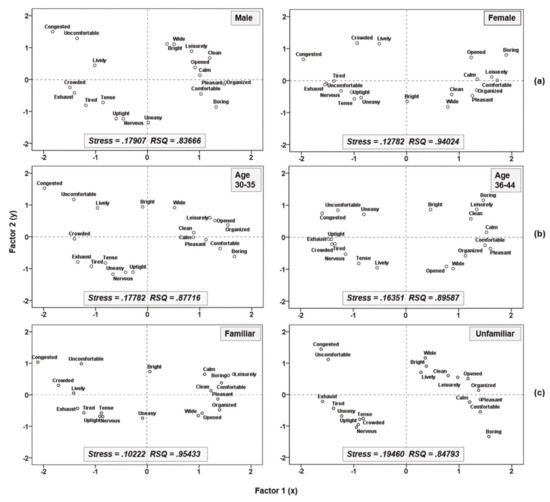For gender (see Figure 2a), it is the estimated distance between the coordinates of the emotional vocabulary in males (Stress = 0.17907, RSQ = 0.83666) and females (Stress = 0.12782, RSQ = 0.94024) (the relationship distance between keywords groups), which can be interpreted as an emotional evaluation. The groups of emotional affective keywords located on the x-axis and y-axis look similar, but depending on the gender, the vocabularies of “opened”, “wide”, “bright”, and “boring” are located on the right side of the x-axis, whereas along the y-axis they are on the opposite side for males (top) and females (bottom). The emotional evaluation of the management factor seems to differ according to gender. Depending on the age (see Figure 2b), there is a distinct difference in the distance of the coordinates of the emotional vocabulary between 30–35-year olds (Stress = 0.17782, RSQ = 0.87716) and 36–44-year olds (Stress = 0.16351, RSQ = 0.89587). In the 30–44 year old group, “opened”, “wide”, “organized”, and “pleasant” showed differences in the negative emotional evaluation of management factors. For spatial familiarity (see Figure 2c), there was a distinct difference in the distance of the emotional vocabulary coordinates between the familiar (Stress = 0.10222, RSQ = 0.95433) and unfamiliar (Stress = 0.19460, RSQ = 0.84793) groups. Having a distinct difference in the distance between emotional affective keyword coordinates can be interpreted as meaningful because the relationship between them is clear. In the spatial unfamiliarity group, the keyword “boring” is the most prominently located at the bottom of the management factor, and “uneasy”, “crowded”, and “nervous” are located at the bottom left of the emotional factor and management factor.