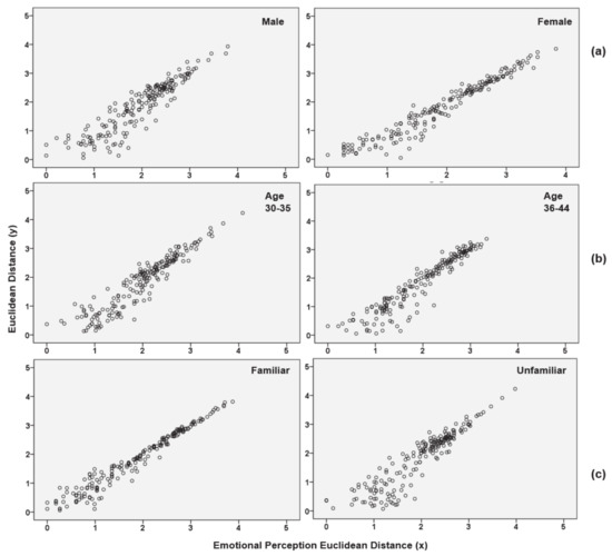 Figure 3 is a scatter plot showing the fit between the actual Euclidean distance and estimated distance for the perceived values according to gender, age, and spatial familiarity. It seems that the multidimensional scale coordinate model of Figure 2 is a good fit because they are all diagonally distributed. In the gender group (Figure 3a), the diagonal distribution is more consistent in females than in males. While, in the age difference group (Figure 3b), the two subgroups show similar distributions. It appears that the scatterplot of the spatial familiarity group (Figure 3c) is more concentrated along the diagonal for familiar responses.