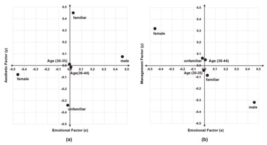 Positioning map on group differences according to factor axis: (a) coordinates of the Emotional Factor(x)–Aesthetic Factor(y) axis; (b) coordinates of the Emotional Factor(x)–Management Factor (y) axis.