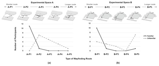 In Experimental space B, the frequency of the shortest distance P1 (n = 10) was overwhelmingly high in the familiar group; whereas the unfamiliar group had the highest frequency for P5 (n = 7). On the drawing, in the cases where the participants got off the elevator and failed to see the information sign, nearly half of them showed the pattern of going back to the other side of the destination at the crossroad due to a commercial building. Given that the ultimate goal of efficient wayfinding is to go from the starting point to the destination in the shortest distance, the frequency difference in the P1 movement pattern in Experimental space A and Experimental space B was not great in the familiar group; whereas, in the unfamiliar group, especially in Experimental space A, almost all participants had difficulty in wayfinding, and in Experimental space B, wayfinding was difficult for 75% of the participants (see Figure 5).