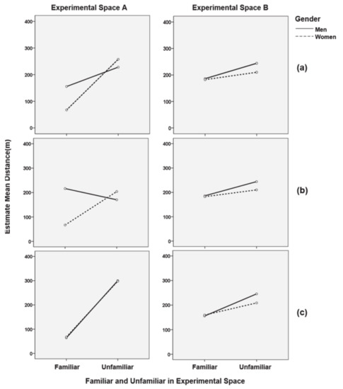 A three-way ANOVA was used to find out if age played any role in the interaction effect between familiarity and gender. The results showed that the interaction effect was not significant for familiarity, sex, and age in Experimental spaces A and B. Regarding the mean differences and interaction effects, in Experimental space A, there was a difference in the interaction between familiarity and gender in the 30s, but not in the 40s. In mean differences, the difference between familiar (216.334 m) and unfamiliar (170.36 m) in men in their 30s was not large, but in women, the difference was great between familiar (66.97 m) and unfamiliar (204.16 m). In their 40s, the values for familiar and unfamiliar groups were almost the same for both genders: males with familiar (64 m) and unfamiliar (300.12 m), and females with familiar (67.66 m) and unfamiliar (297.70 m). In their 30s, males in Experimental space B had familiar (186.03 m) and unfamiliar (244.10 m), whereas females had familiar (182.27 m) and unfamiliar (210.23 m). In their 40s, males had familiar (155.55 m) and unfamiliar (245.62 m), whereas females had familiar (159.56 m) and unfamiliar (208.80 m). The results of this analysis are summarized as follows (see Figure 6).