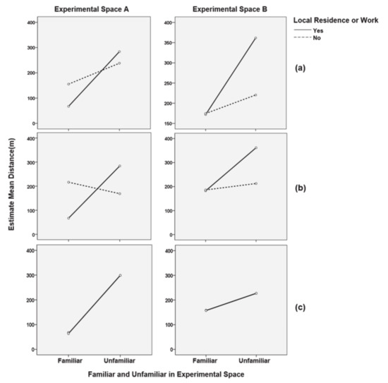 If their residence or workplace was in the test area, participants may be familiar with the surrounding traffic. Thus, the interaction between familiarity and locality was tested. Results showed that the main effects of familiarity and locality were not significant in Experimental space A. However, in Experimental space B, the main effects for familiarity (F = 12.561, p < 0.01) and locality (F = 4.349, p < 0.05) and their interaction effect (F = 4.682, p < 0.05) were all significant. In the mean comparison, the difference between familiar (67.32 m) and unfamiliar (283.9 m) of local residents in Experimental space A was large, and the difference between familiar (155.32 m) and unfamiliar (238.11 m) of non-local residents was not large. In Experimental space B, the difference between familiar (172 m) and unfamiliar (361.7 m) in local residents doubled, and the difference between familiar (174.6 m) and unfamiliar (220.48 m) in non-local residents was rather small.