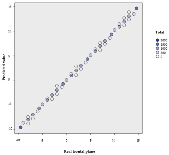 - Pre-swing: This is the end of the period of medium support and the beginning of the propulsive period. At this moment, the subtalar joint must already be supinated, or very close to supination under normal conditions [35]. The regression formula indicates that 5° or less in the FPA is acceptable regarding all of the tilts of the rearfoot in the sagittal plane that do not surpass 20°, provided that we accept that the error is not important from a clinical point of view. It is also confirmed that the greater the conjunction between deviations in the perpendicularity of the FPA and the sagittal plane (in this case 20° and 20°, respectively), the greater the distortion, which, in the maximum expression of all of the ranges studied for all of the frontal planes, is 7°. In this last case, our research is especially necessary.