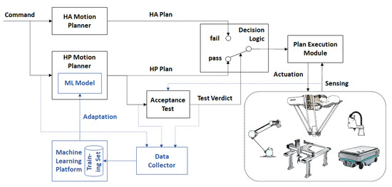 The original SA switches control from the HP controller to the HA controller permanently upon the first violation of the recovery region in order to ensure the safety of a critical system (e.g., an airplane). By contrast, the ASA emphasizes performance while maintaining safety. Therefore, it switches dynamically back and forth between the HP and HA planner. This dynamic behavior is facilitated by a reliable acceptance test (AT), which is capable of checking whether the HP planner’s output is correct and, therefore, safe. The purpose of emulating motion planning algorithms using ML models is to speed up the generation of motion plans during runtime thanks to the low algorithmic complexity of model scoring compared to that of heuristic, graph-based motion planning. Since a ML model may provide correct predictions for some inputs and incorrect predictions for others, the goal is to maximize the use of the faster HP planner while maintaining safety. An optimal, yet possibly slow computational motion planning algorithm can be used to train a ML model that is used as the HP planner, whereas a simple, fast, and reliable motion-planning algorithm can be used as the HA planner. This latter algorithm can be a faster, less accurate version of the same algorithm that is used to train the ML model.