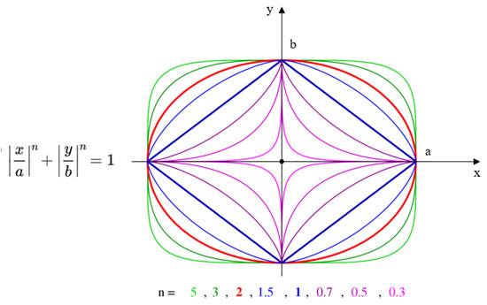 Figure 5 shows the Lamé curve equation and the different shapes that it can take, depending on the a, b, and n parameters. Assuming that the path from an origin point to a target point in the robot’s base coordinate system intersects an obstacle (see Figure 4), the obstacle avoidance problem with path length minimization can be formulated as: