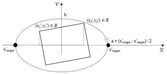 In Equation (1), N denotes the number of discrete segments along the elliptical path between the origin and target, as illustrated in Figure 6, and B denotes a set of representative points on the bounding box, as shown in Figure 6. The representative points on the 2D-bounding box in Figure 6 coincide with the intersection points on the 3D-bounding box illustrated in Figure 4. In Figure 6, when the obstacle is avoided in a vertical plane, the Y′-axis corresponds to the Z-axis in the robot’s base coordinate system. In general, the coordinate system in Figure 6 corresponds to the plane in which the curve is drawn, with the origin and target points lying on the X-axis of that coordinate system.
