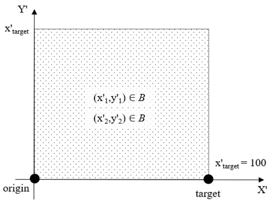 Range of the uniformly distributed baseline training data. The baseline data covers the entire problem space. Compared to Figure 6, the X′-axis is translated to the right by (x′target/2).