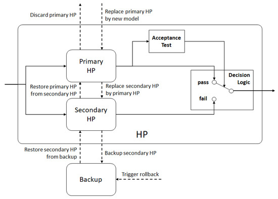 The HP planner is updated whenever a new ML model is available. Since data generation is continuous, the model training process can be configured to update the HP planner at regular intervals. When a new model is deployed as the HP planner, there is a likelihood that it will perform worse than the current model. To prevent the performance degradation of the ASA, the HP planner can be implemented as a recovery block [46], as shown in Figure 8. When a new model becomes available, it is deployed as the primary HP, whereas the then–current primary HP replaces the secondary HP, which is stored for backup. If the new model performs worse than the secondary HP (i.e., the former primary HP), then a rollback is triggered, which restores the primary and secondary HPs as they were before the new model was deployed. This strategy helps to automate the creation and deployment of a new ML model as the HP planner without degrading the overall performance of the ASA.