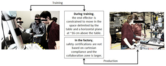 In a second scenario (denoted Edubot—see Figure 10) [53,54], the focus is on a manufacturing company that runs a robot operator training center. To ensure safety during training, the company hired a specialized consultancy company to conduct a safety risk assessment for a HRC application for educational purposes involving a Universal Robot 10. Given that no robot confinement structure was used during training and that teach-in-based programming and testing were performed by novice users, the risk assessment recommended that the movement range of the 6-DOF robot be constrained to prevent the robot’s end effector from reaching higher than about 16 cm above the training table and, thus, to prevent any collisions with the trainees’ upper body and head. In addition, the orientation of the end effector was constrained to always point downward, and the speed of the end effector was limited to 150 mm/s. One problem that emerges from these restrictive safety settings is that trainees learn how to use the robot in this Cartesian-compliant mode only to be faced with a completely different situation in productive applications, which are not subjected to the same cartesian compliance rules, provided that all robot movements and positions are predefined and fixed so that the risk assessment can be conducted based on force and momentum measurements. In this context, the manufacturing company seeks to align the safety principles used during training and the factory settings so as to facilitate the trainees a smoother transition from educational to productive robot use.