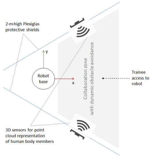The ASA aims to improve on this solution by providing a fast and reliable dynamic obstacle avoidance solution for the training setting so that the 16-cm limit can be gradually increased, depending on the experience of the trainees, until it can be eliminated completely. For this purpose, the robot station can be redesigned, as shown in Figure 11. The robot is partly confined by two Plexiglas protective shields on the sides so that only the trainee who currently works with the robot can access it from one side, while the other trainees can watch the robot in motion from behind the shields. The collaboration zone is surveilled by two 3D sensors that are able to detect and trace the trainees’ hands and other body parts. The 3D sensors generate point clouds, around which bounding boxes can be computed as inputs to the path planner. The grey trapezoid in Figure 11 is a table at ~1 m above the ground. Using dynamic obstacle avoidance during program testing, the constraints resulting from the initial risk assessment can be gradually lifted as the trainees gain more theoretical knowledge and practical experience.