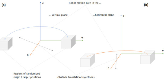 Sketch of the test configurations with dynamic obstacle avoidance in the (a) vertical and (b) horizontal planes.