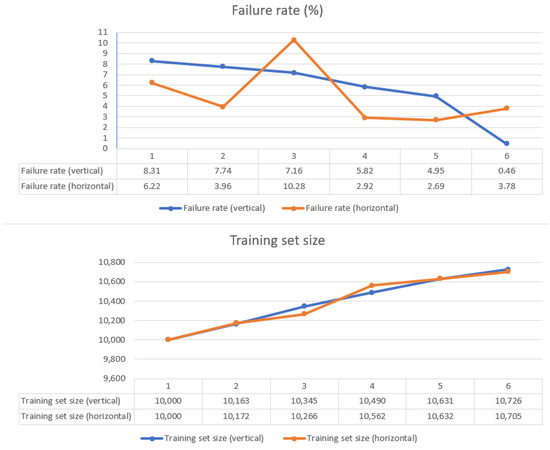 Top: The failure rates of the 6 different models used during the evaluation in the vertical and horizontal test configurations. Bottom: The size of the training sets used to train the 6 models.