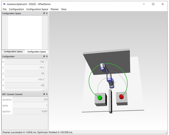 To ensure real-time collision avoidance, each link of the robot was endowed with nine equidistant collision checkpoints, two of which were placed in the adjacent joints. During the motion, the planner checks at a frequency of 33 Hz whether any of the collision checkpoints finds itself within the bounding box around the obstacle. This enables a fast reaction by the motion planner whenever a potential collision with the obstacle is detected—in which case, the robot stops and waits until the obstacle moves away. Note that, in the considered human–robot collaboration scenarios, the obstacles are primarily represented by moving hands and other body members rather than fixed objects. In this context, it is assumed that the human will not willingly block the robot without a good reason (e.g., a safety hazard or a planned action); in which case, the robot must stop. It is also assumed that the human–robot collaboration applications are designed such that the origin and target poses are not impossible to reach (e.g., due to fixed objects).