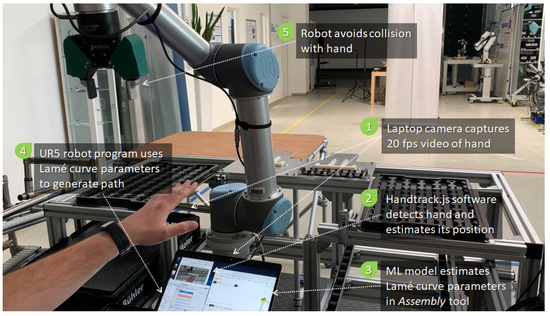 A program that uses the Lamé curve equation to generate an elliptical toolpath between two randomized poses was implemented in the robot’s native programming environment, called Polyscope. The robot program is coupled with the Assembly environment, where the ML model is used to estimate the Lamé curve parameters. For the purpose of this experimental validation, a simple visual hand tracking library called Handtrack.js (available online: https://github.com/victordibia/handtrack.js/ (accessed on 21 March 2021)) was used to estimate the position of the hand. Based on that information, a bounding box was computed around the hand in the simulation environment. This facilitated the computation of the Lamé curve parameters. The communication between the Assembly simulation environment and Polyscope was implemented using remote procedure calls over the XMLRPC protocol. The robot program polled the XMLRPC service provided by Assembly every 100 ms. This service returned the Lamé curve parameters corresponding to the current size and position of the bounding box.