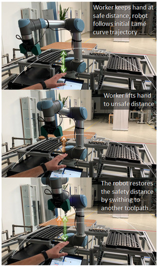 Figure 18 illustrates the dynamics of the experiment. As the robot moves between two arbitrary poses, it reacts to the position of the moving hand by adapting the current toolpath. The following video illustrates this behavior: reference [59]. For safety reasons, the speed of the robot was limited to 250 mm/s. Note that the communication over XMLRPC induced latency, which can be avoided by using a hardware-based protocol, like MODBUS. Additionally, the precision and performance of the Handtrack.js library are average. Higher performances can be obtained using a state-of-the-art 3D sensor and a fast object detection method. Using these technologies, the robot can operate at higher speeds without posing any safety risks.