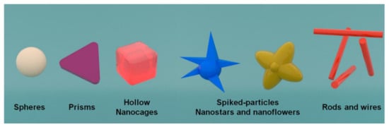 Nanotechnology’s development makes it possible to synthesize nanostructures of virtually any shape by chemical strategies or even by 3D printing []. This capability to produce nanoparticles with multiple anisotropic (non-spherical) morphologies results in structures with enhanced photoluminescence, different biomolecule interactions, modification of localized surface plasmon resonance, surface charge, and (electro)catalytic performance due to a different electron confinement and the change in electron transport property regarding isotropic (spherical) particles [,]. For instance, it is reported that the photocatalytic activity of multiarmed CdS rod particles is higher than spherical particles [].