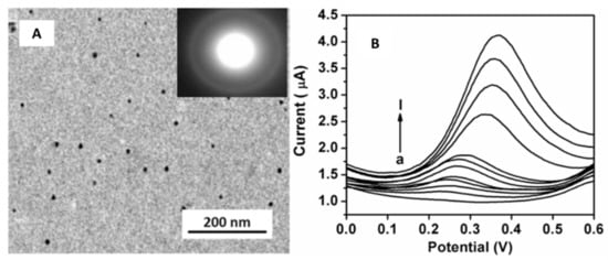 (A) TEM micrograph of GR/CD/Pt composite. (B) CV response of cysteine at the SPE modified with the GR/CD/Pt in a concentration range of 0.5–170 µM in 0.1 M PBS buffer pH 7.4. Reproduced with permission of Singh et al., Journal of Electroanalytical Chemistry; published by Elsevier, 2018 [].