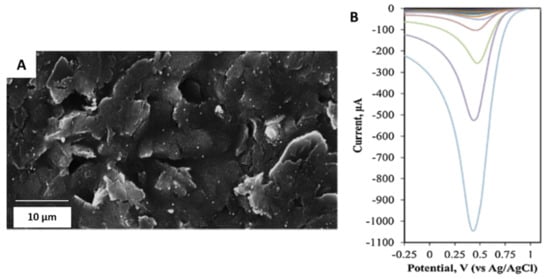 (A) SEM micrograph of Rh-NPs deposited on SPEs. (B) Cathodic stripping voltammograms of modified electrodes recorded using 150 μL drop of supporting electrolyte with bromide. The cathodic linear sweep voltammetry scan was from 1.11 to −0.25 V at a scan rate of 0.10 Vs−1. Reproduced with permission of Cunha-Silva and Arcos-Martínez, Sensors and Actuators B: Chemical; published by Elsevier, 2019 [].