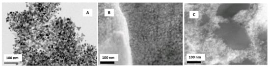 (A) TEM micrograph of Ru-NPLs obtained through the hydrothermal reduction of Ru salt by formaldehyde in the presence of PVP. SEM micrographs of Ru-NPLs in H2O, (B) in ethanol, (C) modified screen-printed graphene electrode. Reproduced with permission of Baradoke, Pastoriza-Santos y González-Romero, Electrochimica Acta; published by Elsevier, 2019 [].