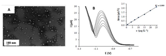 In addition, triangular-shaped nanoparticles were synthesized for the voltammetric determination of heavy metal ions. Torres-Rivero et al. [,] synthesized silver nanoparticles (Ag-nanoseeds and Ag-nanoprisms) by the seed mediated approach [,]. SEM and TEM images showed that the Ag-nanoprisms had triangular morphology with a size between 14.25 and 16.46 nm (Figure 5A). After the nanoparticle synthesis, the investigators performed a modification onto the screen-printed carbon nanofibers electrodes (SPCNFE) surface by a drop-casting strategy [,] using the Ag-nanoseeds (Ag-NS-SPCNFE) and the Ag-nanoprisms (Ag-NPr-SPCNFE). The electrochemical study was completed to verify the enhancement of the voltammetric response provided by silver nanoparticles. In a previous study, the Pb(II) and Cd(II) ions were determined in an acetic acid/acetate buffer []. In contrast, in another investigation, As(V) ions were detected in a HCl electrolyte [] using the differential pulse anodic stripping voltammetry technique.