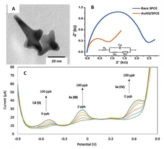 In addition to the traditional shapes, new and novel shaped nanoparticles have been developed. Lu et al. [] synthesized gold nanostar (Au-NS) to modify screen-printed carbon electrodes (SPCE) for the simultaneous detection of Cd(II), As(III), and Se(IV). The morphology and size of the Au-NS were estimated using TEM images (Figure 6A). The average tip-to-tip diameter was 49 ± 14 nm, and the number of spikes per nanostar ranged from 4 to 10. Additionally, the behavior of the gold nanostars on the SPCE was studied using electrochemical impedance spectroscopy. The charge transfer resistance decreased significantly from 2.4 kΩ (bare electrode) to 0.8 kΩ (Au-NS-SPCE) (Figure 6B). This difference was related to the augmented area due to the Au-NS coating the SPE surface.
