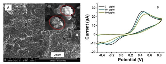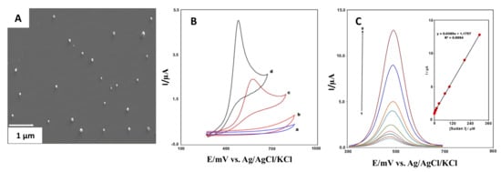 Other studies carried out by Cunha-Silva and Arcos-Martinez [] functionalized a SPE with rhodium nanoparticles (Rh-NPs) using the chronoamperometric technique. The obtained sensor was used for bromide anion determination in seawater, surfactant, and pharmaceutical samples. Figure 3A shows that the SPEs surface modified with the electrodeposited rhodium nanoparticles at −0.25 V for 480 s. Figure 3B exhibited the voltammograms obtained using the modified electrodes in 0.05 M phosphate-buffered saline (PBS) with 0.05 M of NaCl as supporting electrolyte. The bromide concentration ranged from 0 to 40 mM.