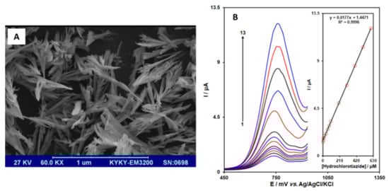 (A) SEM micrograph of La3+-doped ZnO nanoflowers. (B) Differential pulse voltammograms obtained for the La3+/ZnO/SPE in the presence of different concentrations ranging from 1 to 600 µM of hydrochlorothiazide. Inset figure corresponds to the calibration plot for the HCT determination. Reproduced with permission of Rezaei et al., International Journal of Electrochemical Science; published by ESG, 2019 [].