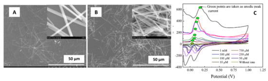 After the synthesis, the investigators modified a screen-printed electrode with the AgNWs and AMT using the drop-casting method []. The modified electrode surface was characterized using SEM; the AgNWs exhibited a 100 nm diameter approximately for a reaction time of 10 min. In comparison, a reaction time of 16 min generated AgNWs with a larger diameter of 125 nm (Figure 10A,B).